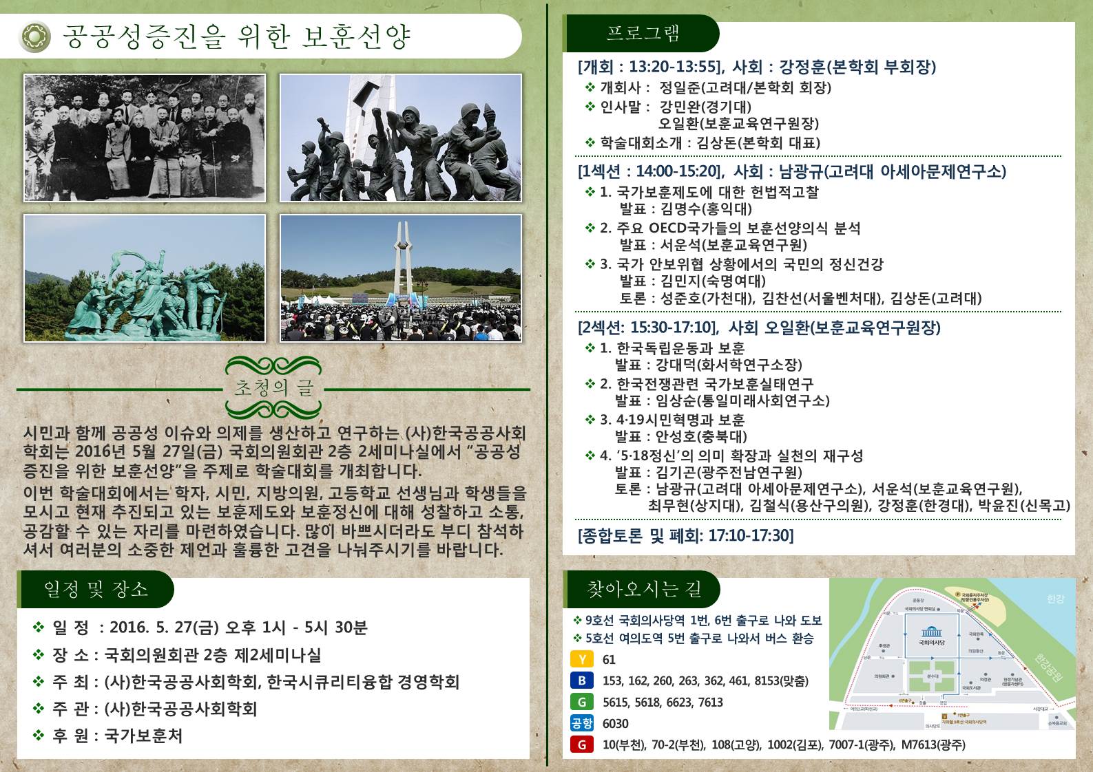 시민과 함께 공공성 이슈와 의제를 생산하고 연구하는 (사)한국공공사회학회는 2014년 5월 27일(목) 국회의원회관 2층 2세미나실에서 “공공성증진을 위한 보훈선양” 주제로 학술대회를 개최합니다. 이번 학술대회에서는 학자, 시민, 고등학교 교사와 교원들을 모시고 현재 추진되고 있는 보훈제도와 보훈정신에 대해 성찰하고 소통·공감할 수 있는 자리를 마련하였습니다. 많이 바쁘시더라도 부디 참석하셔서 여러분의 소중한 제언과 훌륭한 고견을 나눠주시기를 바랍니다.