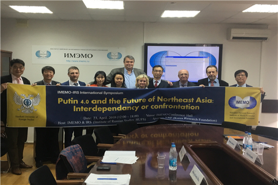 2018년  4월  23(러시아연구소는 러시아 모스크바 소재  세계경제및국제관계연구소 ’(IMEMO) 7층 세미나실에서  푸틴  4.0과 동북아시아의 미래 상호의존과 대립 :(Putin 4.0 and the Future of Northeast Asia: Interdependency and Confrontation)이라는 주제로 심포지움을 개최했다 이번 심포지움은 한국외대 러시아연구소와 모스크바  IMEMO가 공동으로 제작한  <러시아폴리시리뷰 >의 발간을 기념하고 두 연구소의 미래지향적 협력관계를 구축하고자 마련됐다 .