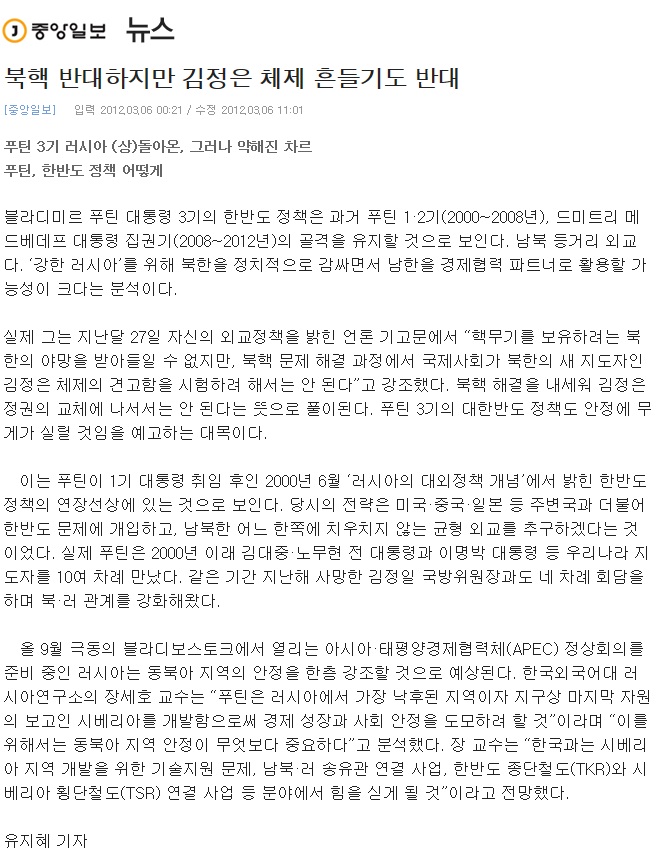 [언론보도]북핵 반대하지만 김정은 체제 흔들기도 반대-중앙일보(2012.3.6)