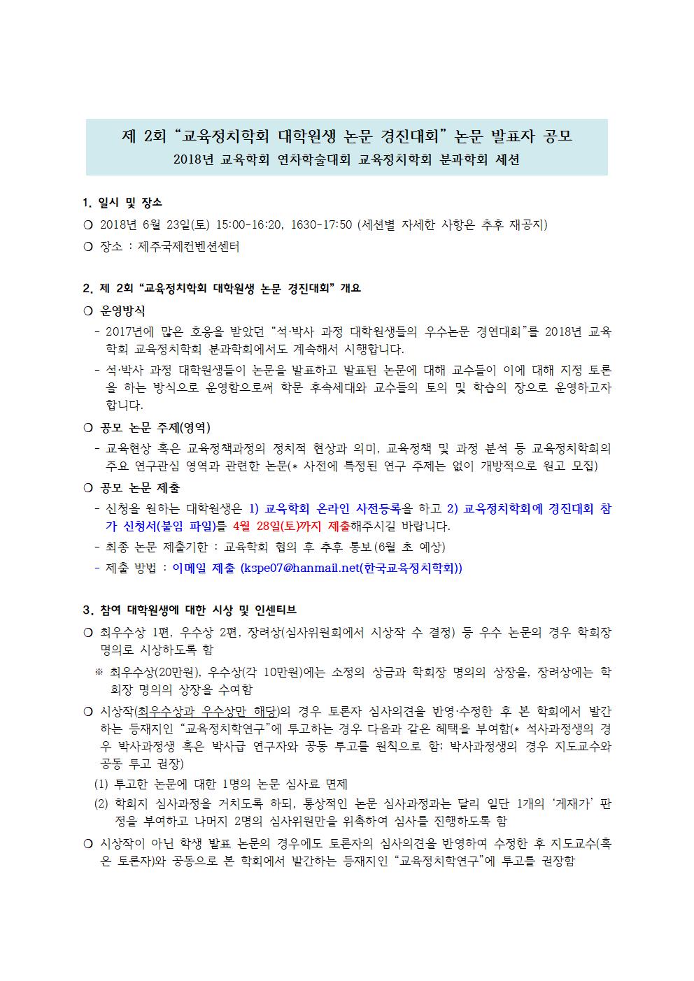 제 2회 '교육정치학회 대학원생 논문 경진대회'를 개최하고자 합니다.