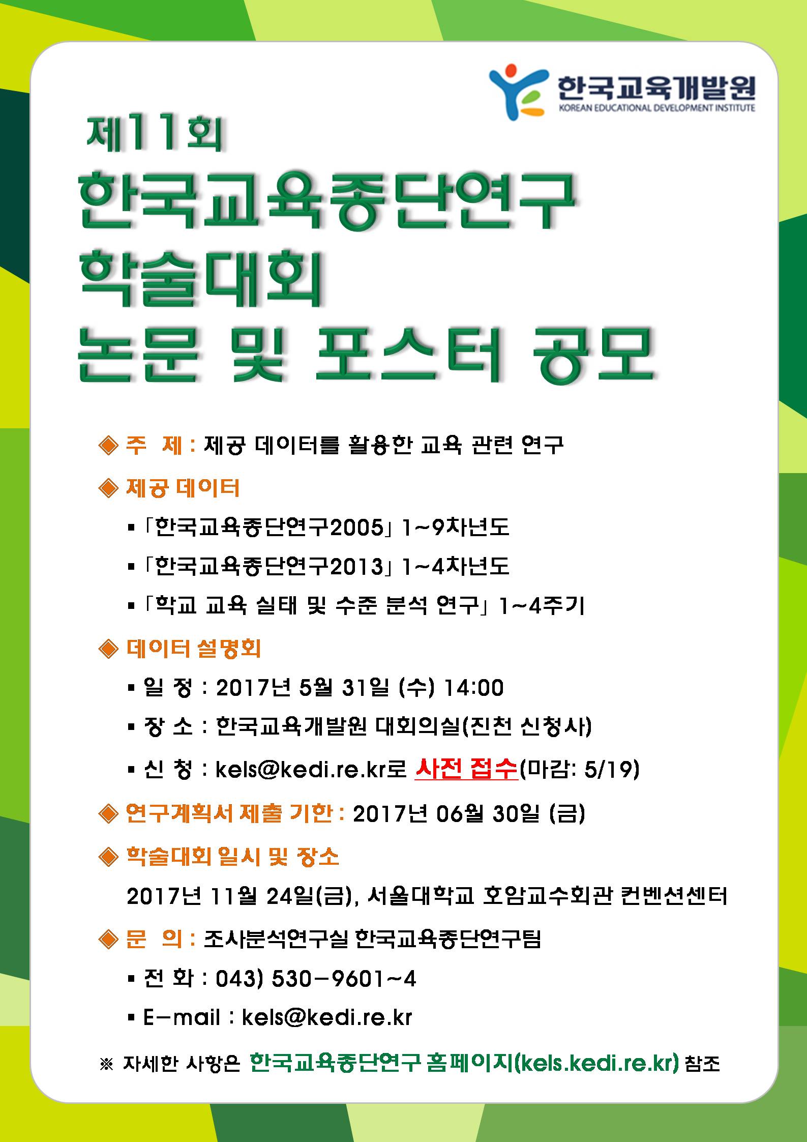 아울러 학술대회 공모자들의 데이터에 대한 이해를 돕고자 제11회 한국교육종단연구 학술대회 데이터 설명회가 5월 31일에 개최됩니다. 자세한 사항은 아래와 같습니다.