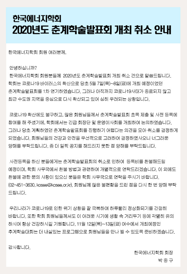 2020년도 춘계학술대회 개최취소 안내