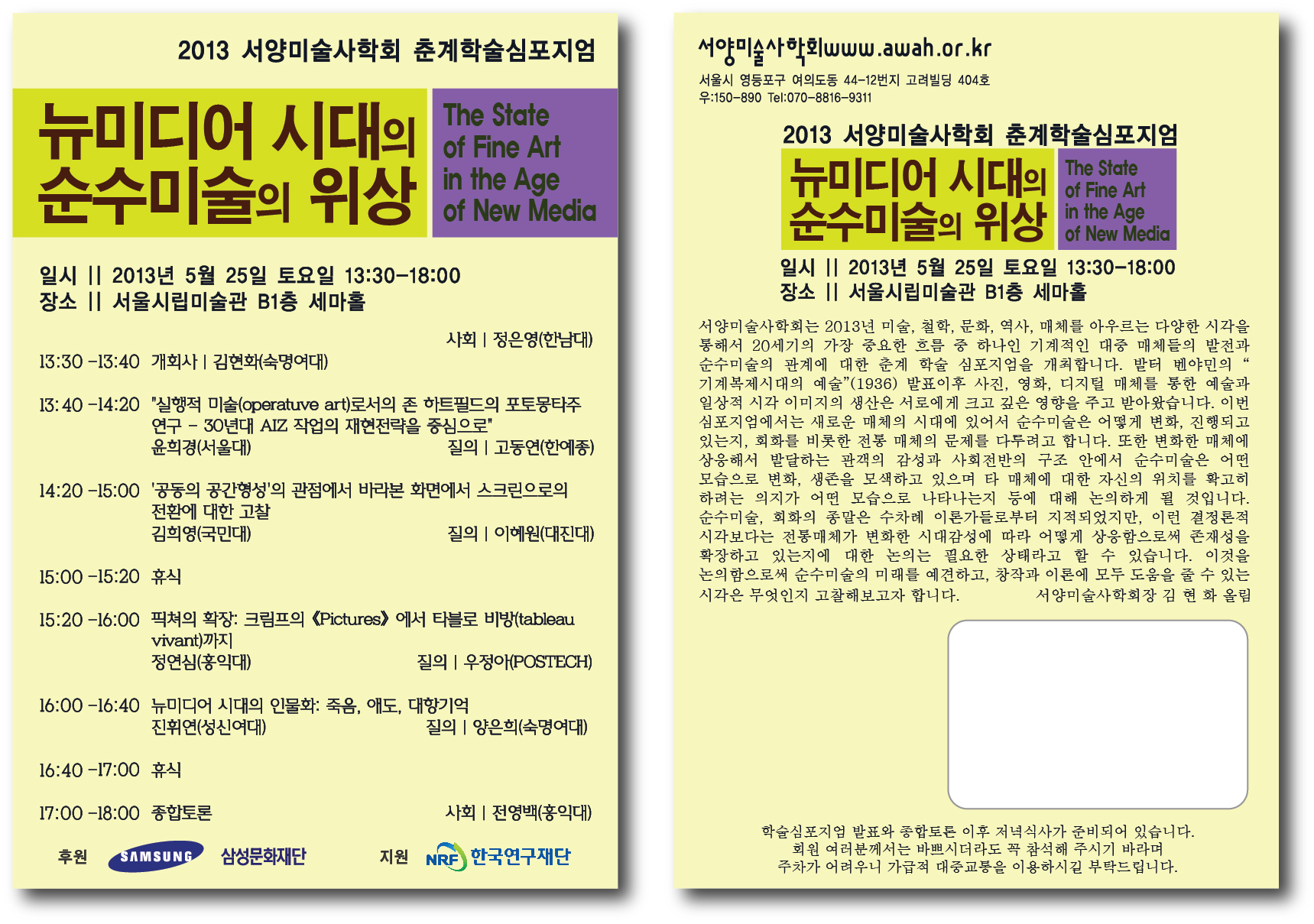 서양미술사학회는 2013년, 미술, 철학, 문화, 역사, 매체를 아우르는 다양한 시각을 통해서 20세기의 가장 중요한 흐름중 하나인 기계적인 대중 매체들의 발전과 순수미술의 관계에 대한 춘계 학술 심포지엄을 개최합니다. 발터 벤야민의 “기계복제시대의 예술”(1936) 발표이후 사진, 영화, 디지털 매체를 통한 예술과 일상적 시각 이미지의 생산은 서로에게 크고 깊은 영향을 주고 받아왔습니다. 이번 심포지엄에서는 새로운 매체의 시대에 있어서 순수미술은 어떻게 변화, 진행되고 있는지, 회화를 비롯한 전통 매체의 문제를 다루려고 합니다. 또한 변화한 매체에 상응해서 발달하는 관객의 감성과 사회전반의 구조 안에서 순수미술은 어떤 모습으로 변화, 생존을 모색하고 있으며 타 매체에 대한 자신의 위치를 확고히 하려는 의지가 어떤 모습으로 나타나는지 등에 대해 논의하게 될 것입니다. 순수미술, 회화의 종말은 수차례 이론가들로부터 지적되었지만, 이런 결정론적 시각보다는 전통매체가 변화한 시대감성에 따라 어떻게 상응함으로써 존재성을 확장하고 있는지에 대한 논의는 필요한 상태라고 할 수 있습니다. 이것을 논의함으로써 순수미술의 미래를 예견하고, 창작과 이론에 모두 도움을 줄 수 있는 시각은 무엇인지 고찰해보고자 합니다.