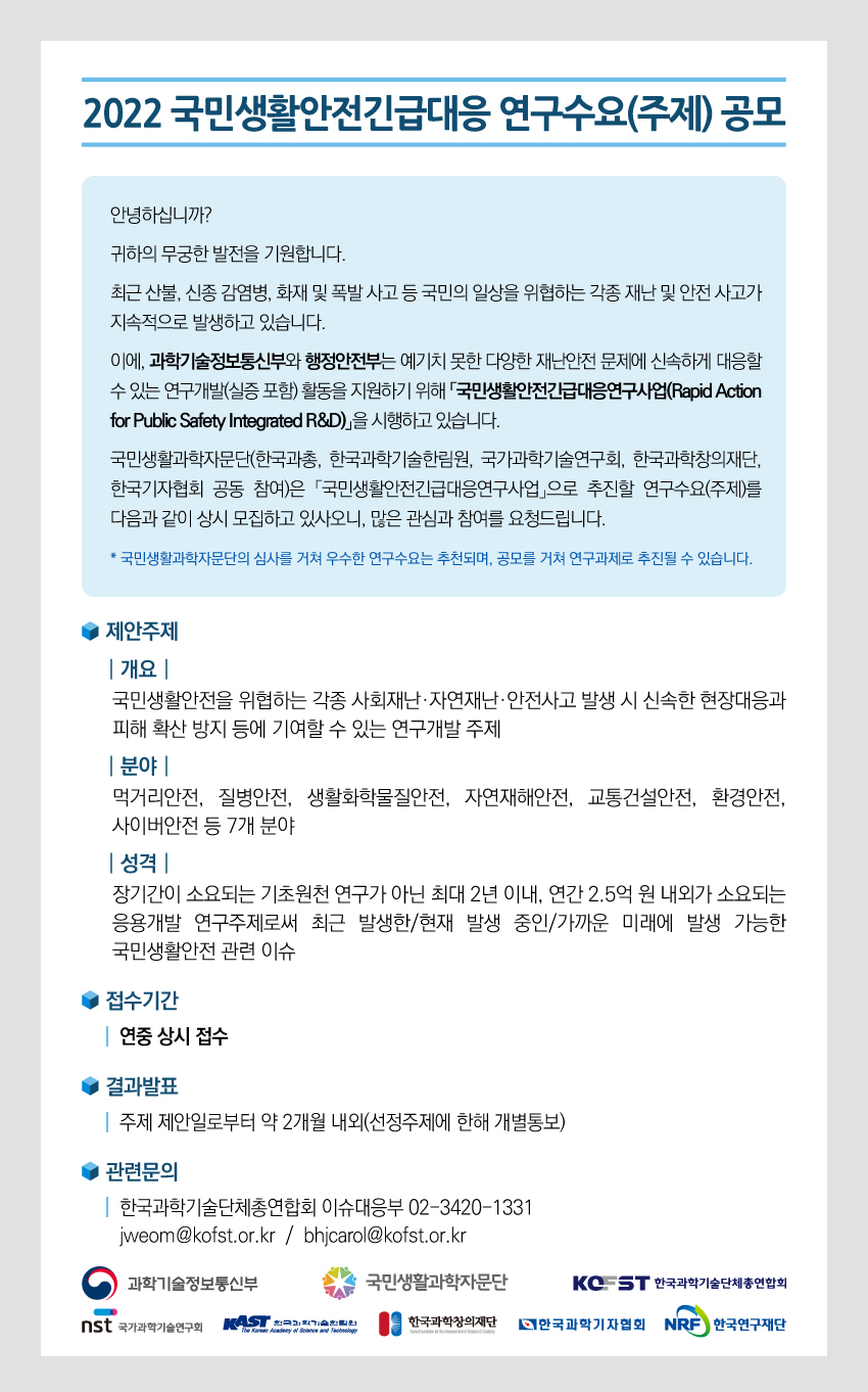 [국민생활과학자문단] 2022 국민생활안전긴급대응 연구수요 공모(상시)