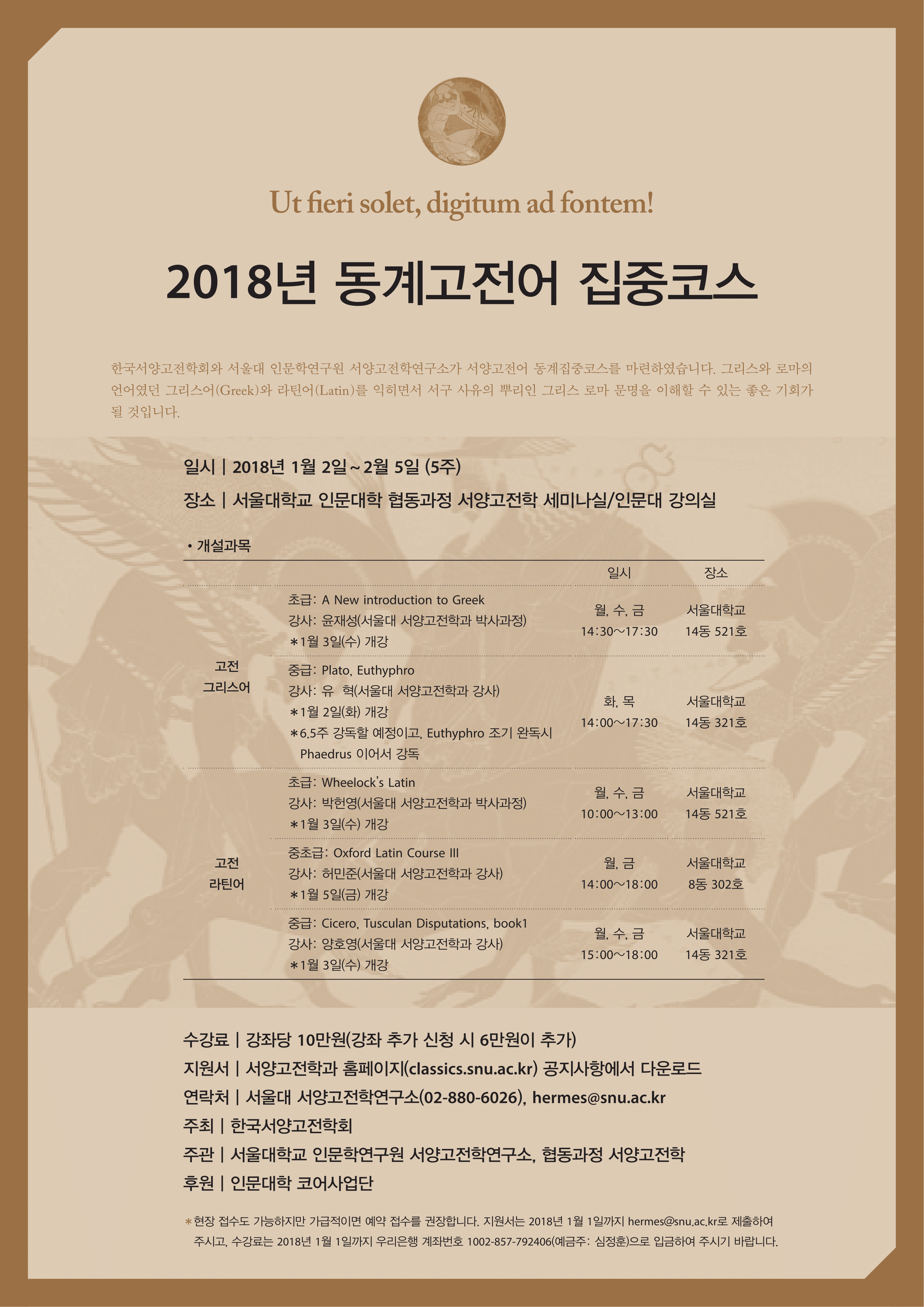 한국서양고전학회와 서울대 CORE 사업단과 서울대 인문학연구원 서양고전학연구소가 2018년 서양고전어 동계집중코스를 마련하였습니다. 그리스와 로마의 언어였던 그리스어(Greek)와 라틴어(Latin)를 익히면서 서구 사유의 뿌리인 그리스 로마 문명을 이해할 수 있는 좋은 기회가 될 것입니다.