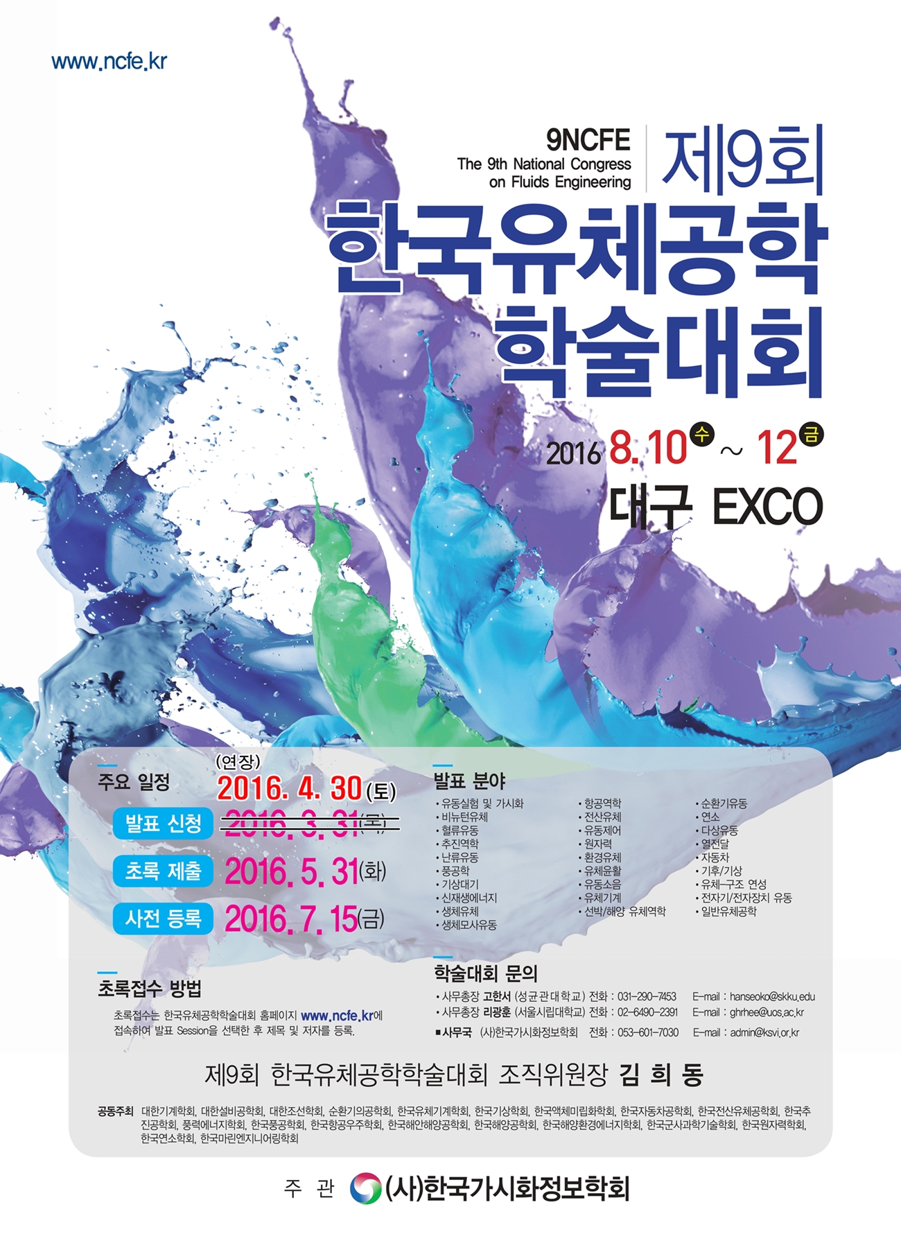 제9회 한국유체공학학술대회(2016년 8월 10일~12일, 대구EXCO)는 (사)한국가시화정보학회 주관으로 우리 학회가 공동주최하는 행사로 아래와 같은 일정으로 개최를 합니다.
