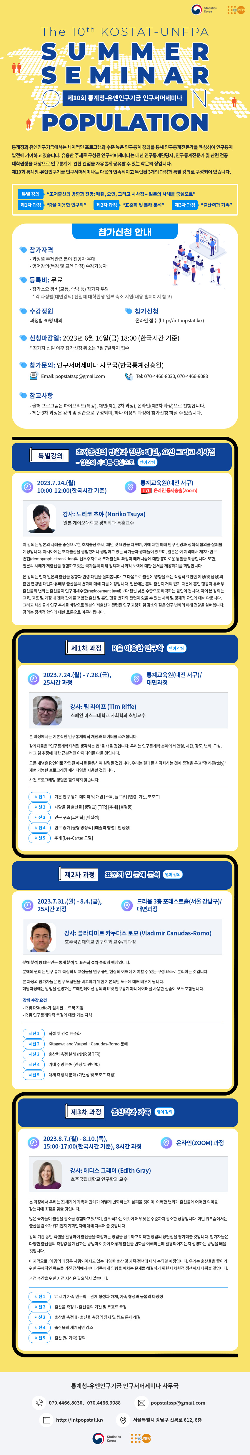 2023년 인구서머세미나는 연속적이고 독립적인 세 개의 과정, 'R을 이용한 인구학', '표준화 및 분해 분석', '출산력과 가족''초저출산의 방향과 전망: 패턴, 요인, 그리고 시사점 - 일본의 사례를 중심으로'를 주제로 한 특별 강의로 구성되어 있습니다.