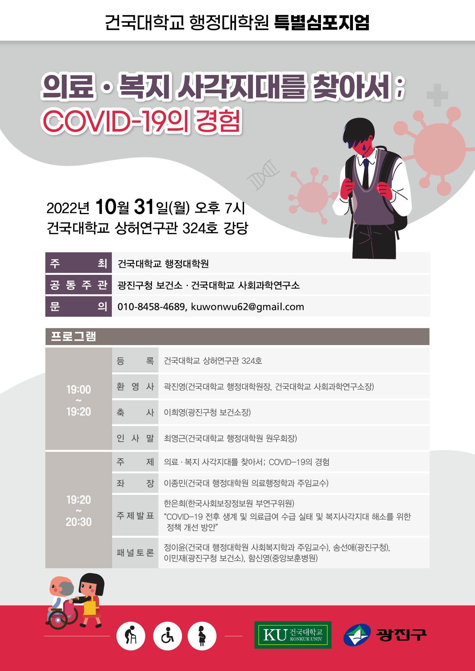 건국대학교 행정대학원에서 의료·복지 사각지대를 찾아서; COVID-19의 경험이라는 주제로 2022년 10월 31일(월) 오후7시부터 특별심포지엄을 개최합니다.