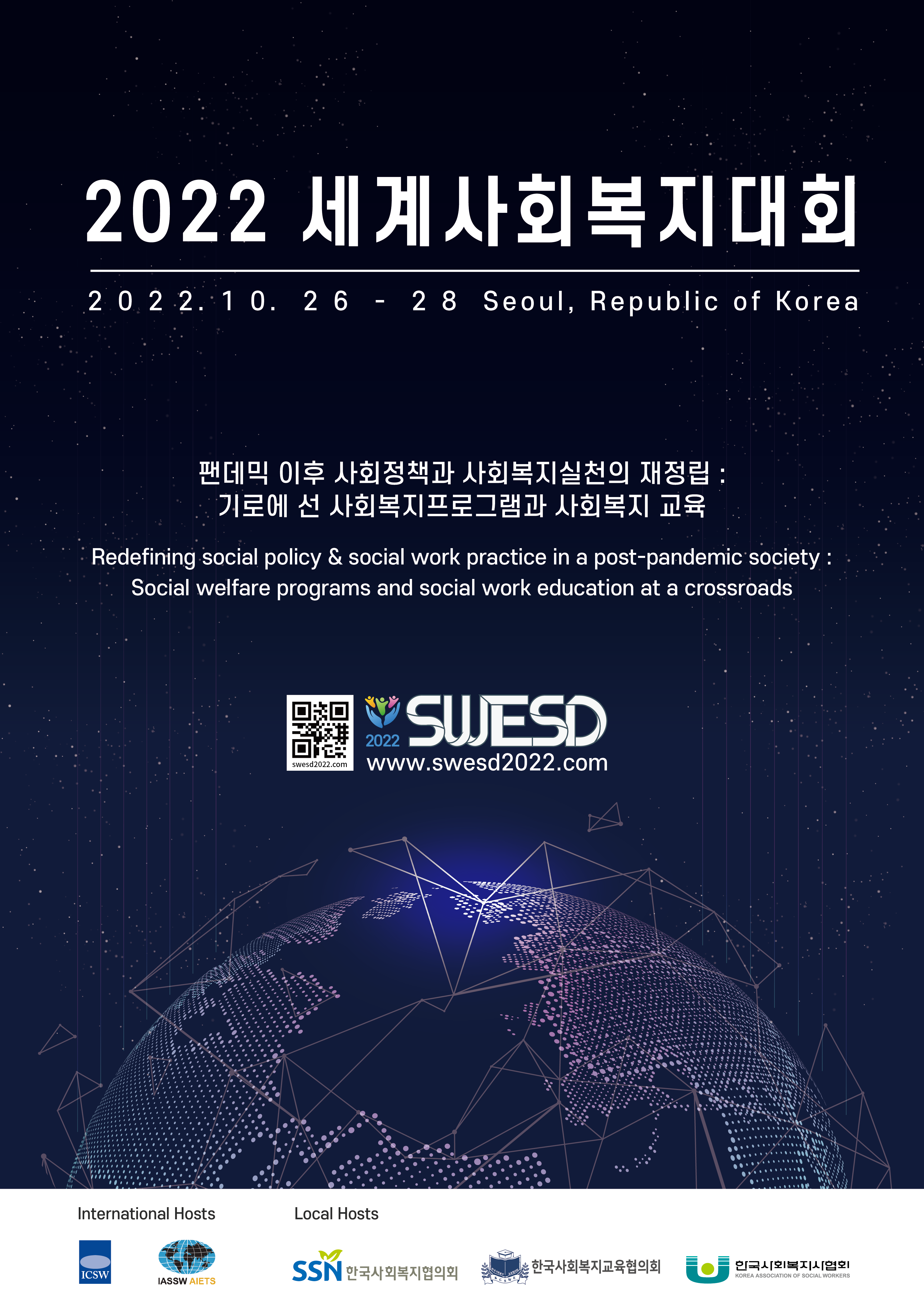 오는 1026()~28() 3일간 2022 세계사회복지대회(SWESD 2022)가 열립니다. 세계사회복지대회는 전세계 사회복지 학자와 현장 전문가들이 참여하는 사회복지인들의 축제입니다. 이번 서울 대회에서는팬데믹 이후 사회정책과 사회복지실천의 재정립을 주제로 1일차 오프라인 행사(기조강연, ESG 특별세션) 2~3일차 온라인 행사(세션발표, 포스터, 심포지엄 및 워크숍)를 진행합니다.