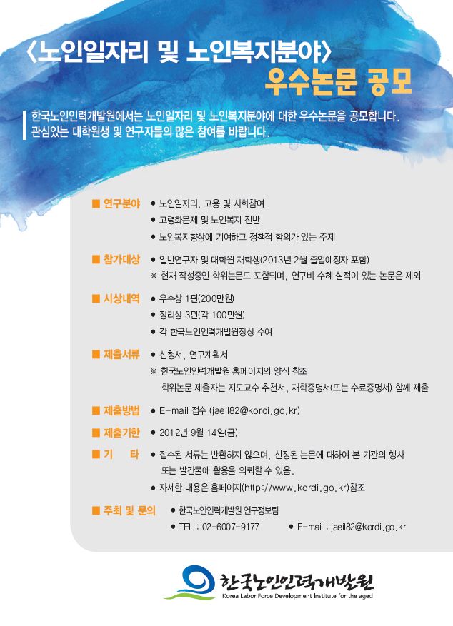 일반연구논문과 학위논문 모두 가능하며 관심 있으신 분께서는 첨부파일의 내용과 한국노인인력개발원 홈페이지(http://www.kordi.go.kr)를 참조해 주십시오.