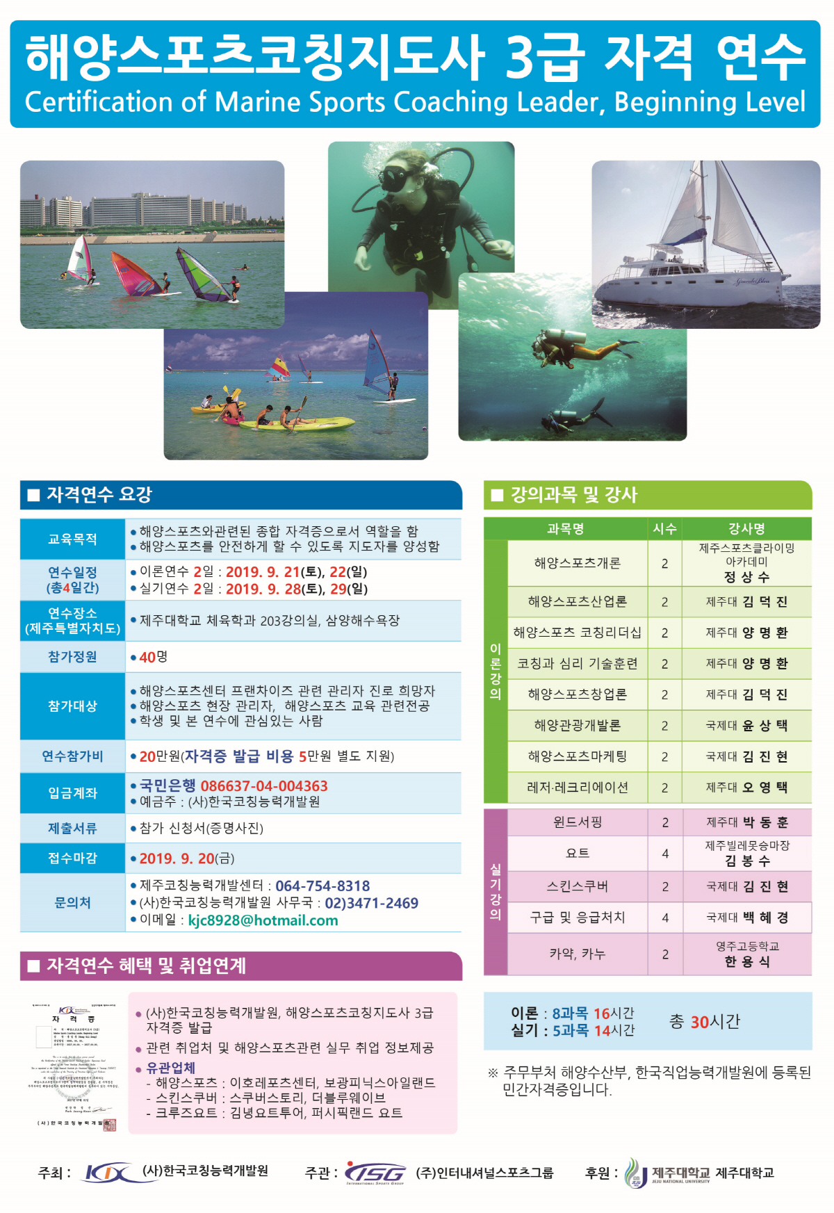 2019년도 해양스포츠 코칭지도사3급 자격연수가 제주대에서 9월 21일부터 시작됩니다.