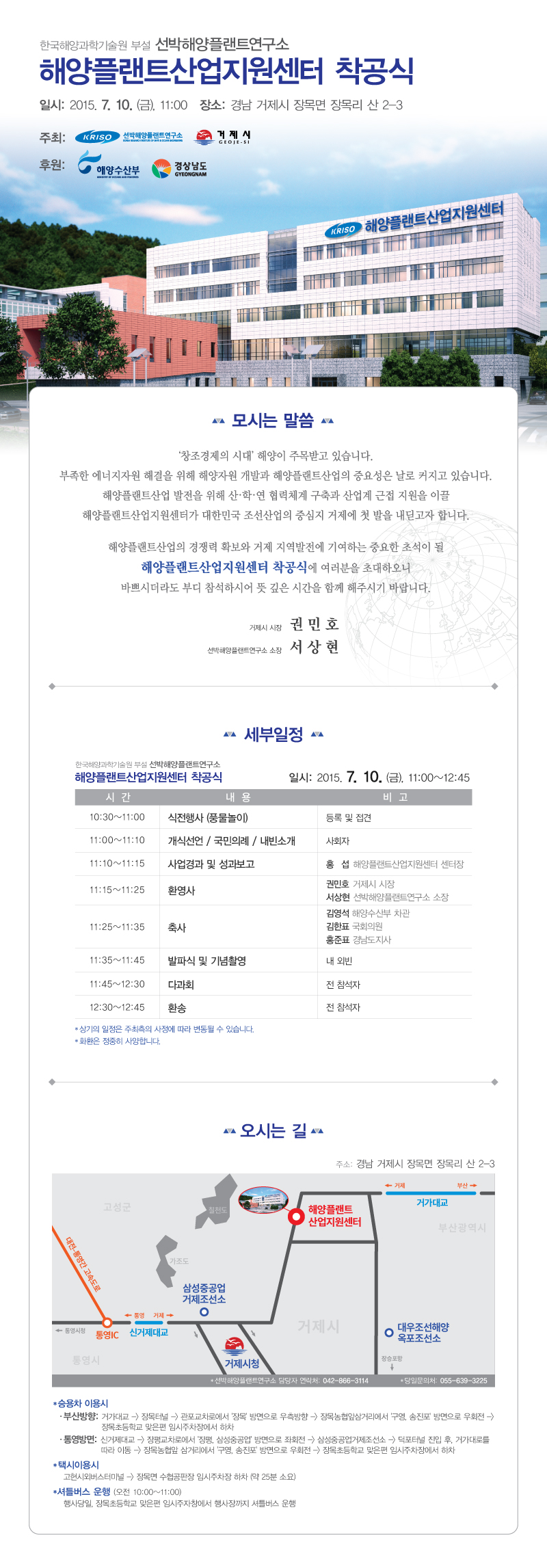 해양플랜트산업의 경쟁력 확보와 거제 지역발전에 기여하는 중요한 초석이 될 한국해양과학기술원 부설 선박해양플랜트연구소 '해양플랜트산업지원센터 착공식'에 여러분을 초대하오니 바쁘시더라도 부디 참석하시어 뜻 깊은 시간을 함께 해주시기 바랍니다.