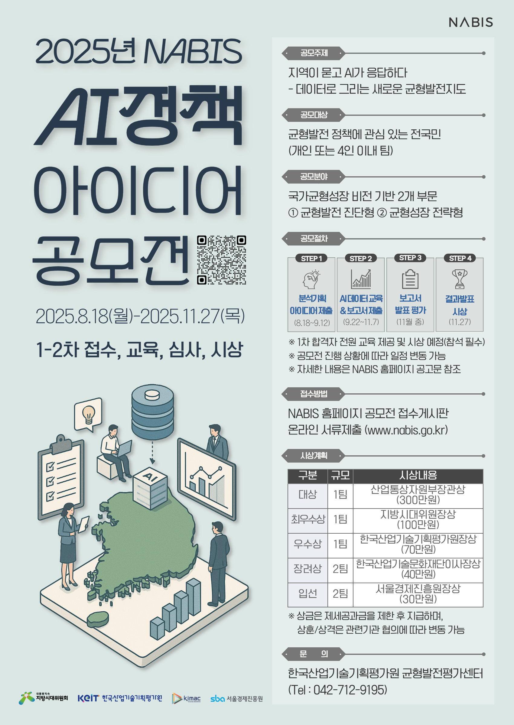 대통령직속 지방시대위원회 주최, 한국산업기술기획평가원·한국산업기술문화재단·서울경제진흥원 공동주관으로 진행중인 <2025년 NABIS AI 정책 아이디어 공모전>을 소개하고자 공지 드립니다.