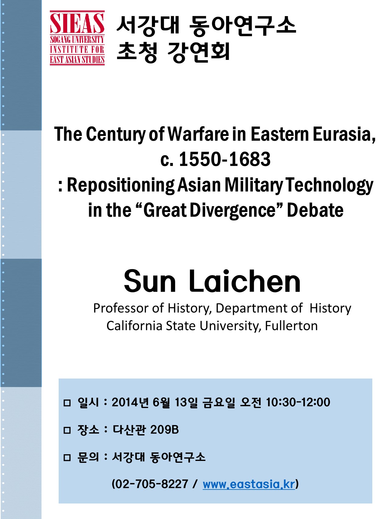o 강연내용: This lecture is part of Sun Laichen’s ongoing book project, which examines warfare in Eastern Eurasia during the period of 1550-1683 (the “long seventeenth century”). It aims to reconstruct the history of Eastern Eurasia from a military historical approach by identifying a “century of warfare” based on frequency, scale, and social impact of war and military innovation, arguably the most warlike era in pre-modern times, and perhaps for all of recorded history. In the process, it intervenes in the “Great Divergence” debate by repositioning Asian military technology in the early modern period. Sun Laichen’s unprecedentedly comprehensive reconstruction of Eastern Eurasian warfare and military innovation allows a deeper assessment of the position of Asian military technology vis-?-vis European military technology. The result is a much more nuanced perspective, one which departs from the positions of the various sides in the Great Divergence debate: orthodox, revisionist, or even middle-grounder.