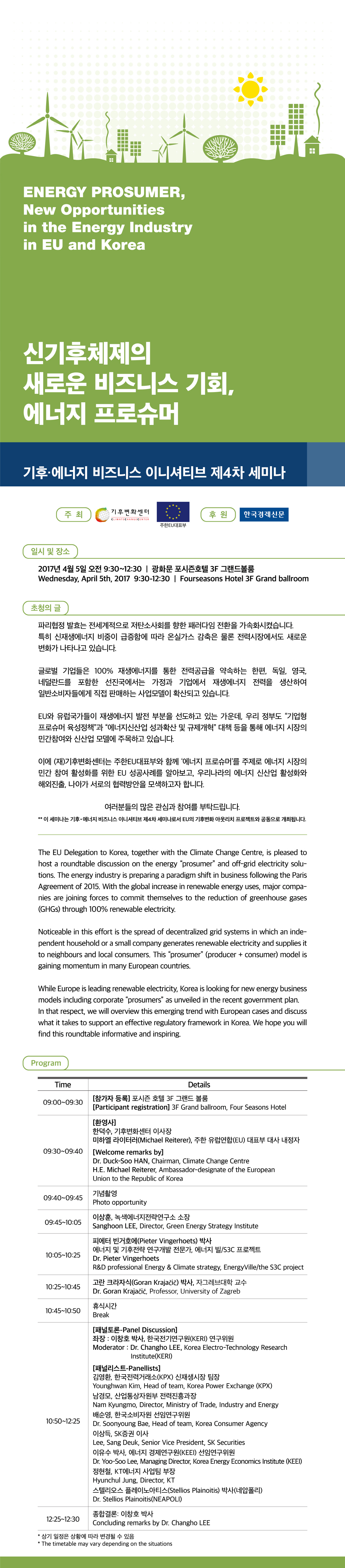 기후변화센터에서는 주한 EU대표부와 함께 신기후체제의 새로운 비즈니스 기회에너지 프로슈머 라는 주제로 세미나를개최합니다.