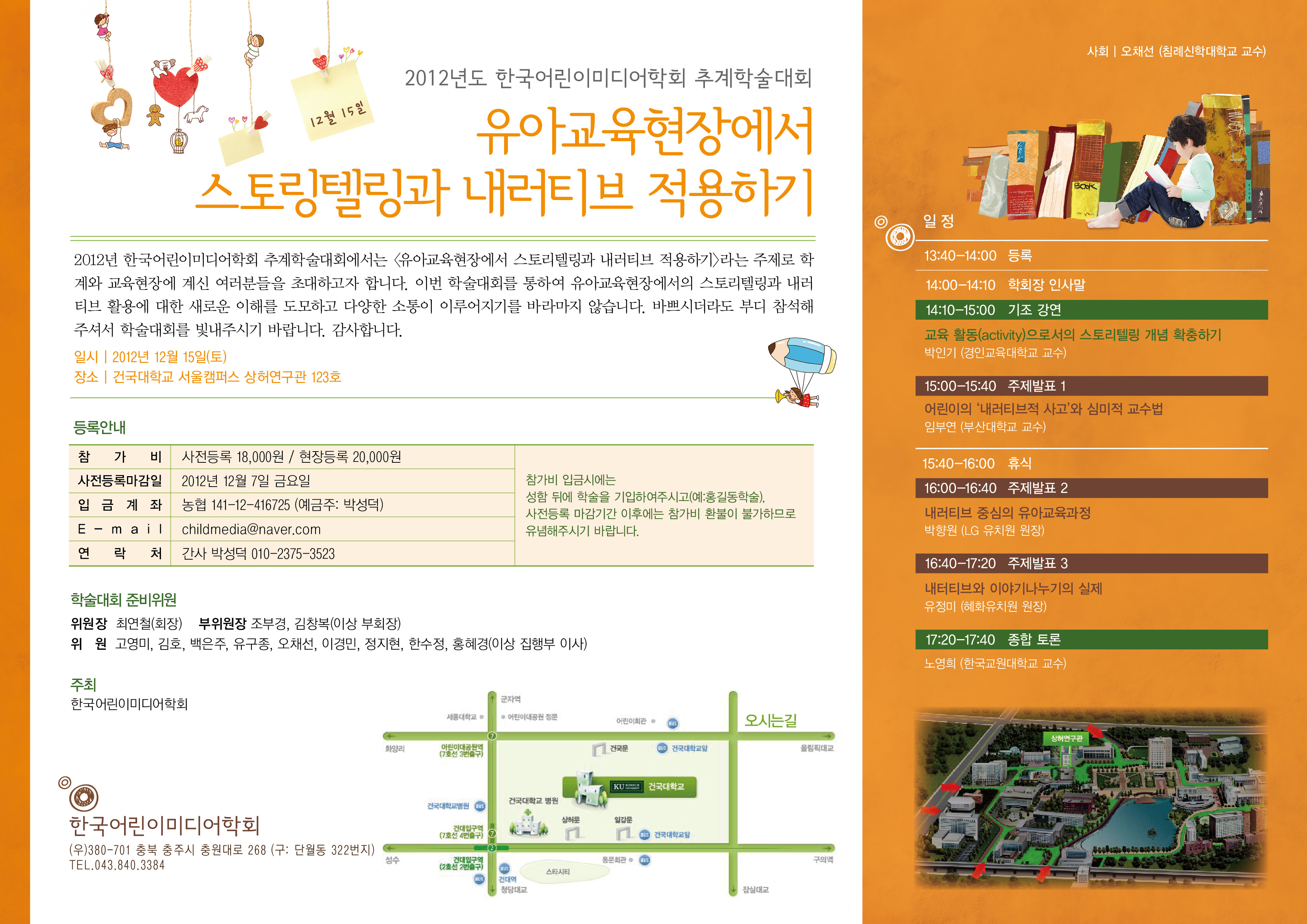 2012년 한국어린이미디어학회 추계학술대회에서는 <유아교육현장에서 스토리텔링과 내러티브 적용하기>라는 주제로 학계와 교육현장에 계신 여러분들을 초대하고자 합니다. 이번 학술대회를 통하여 유아교육현장에서의 스토리텔링과 내러티브 활용에 대한 새로운 이해를 도모하고 다양한 소통이 이루어지기를 바라마지 않습니다. 바쁘시더라도 부디 참석해주셔서 학술대회를 빛내주시기 바랍니다.