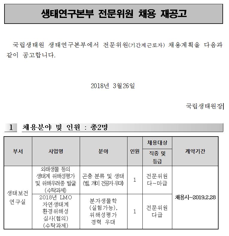 - 문    의 : 국립생태원 생태연구본부 채용담당자 (041-950-5319)