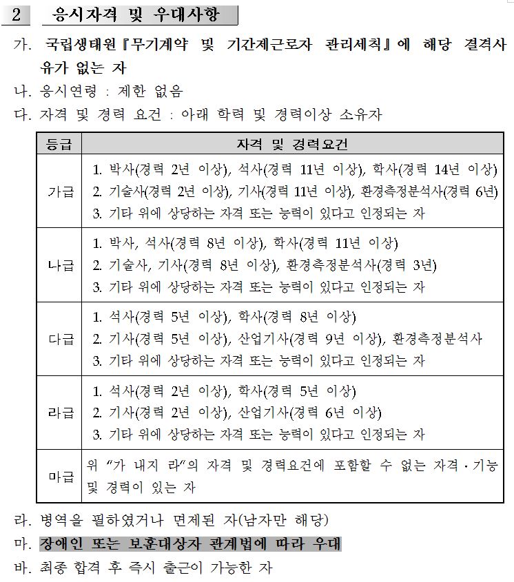 라. 접수처 주소 : (33657) 충남 서천군 마서면 금강로 1210 국립생태원 생태연구본부 기간제근로자 채용담당자 앞