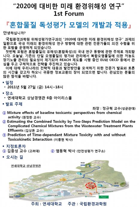 안녕하세요! 연세대학교 환경공해연구소입니다. 국립환경과학원 위해성평가연구과의 '2020에 대비한 미래 환경위해성 연구(과제책임자 : 노경태 교수(연세대))' 과제 일환으로 국내 미래의 환경위해성 연구 방향에 대해 관련 전문가들의 의겸 수렴을 위한 “전문가 포럼(세부책임자 : 신동천 교수(연세대))”을 운영하게 되었습니다. 첫 번째 포럼은 “혼합물질의 유해성(독성)' 주제로 진행하고자 합니다. 혼합물질의 위해성평가에 대해 우리나라의 전략적 대응과 발전 방안을 모색하기 위한 전문가 발표와 토론의 시간을 갖고자 하오니 귀중한 정보교환의 장이 되었으면 합니다. 많은 전문가 선생님들의 참석을 부탁 드리며, 포럼 관련 문의 사항이 있으시면 성균관대학교 예방약학 실험실(담당자: 박용주(031-290-7754, pyj084@msn.com)로 연락 주시기 바랍니다. 원활한 행사진행을 위해 5월 20일(금)까지 참석가능한 분들은 메일로 답변 주시기 바랍니다. 감사합니다. 연세대학교 분자설계연구소 노경태, 환경공해연구소 신동천 올림 |
