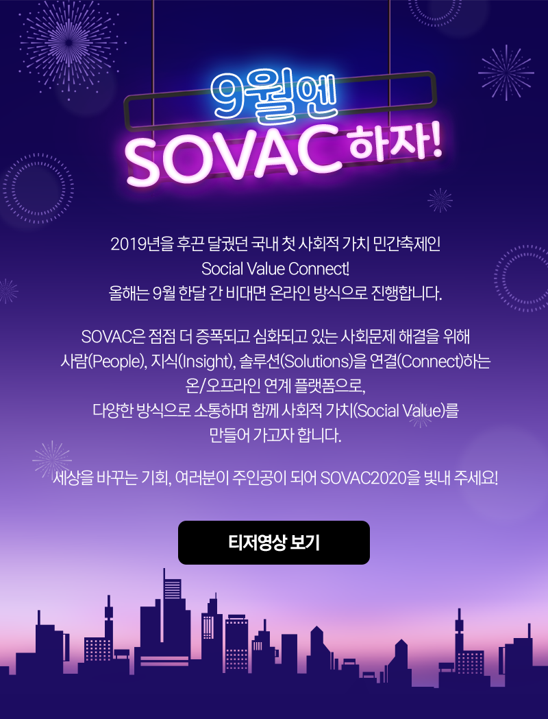 SOVAC행사는, Social Value Connect의 약자로 사회적 가치에 대한 공감대 확산과 점점 심화되고 있는 사회문제 해결을 위해 다양한 분야의 사람들이 모여 협력을 키워나가는 Social Value Community 입니다.