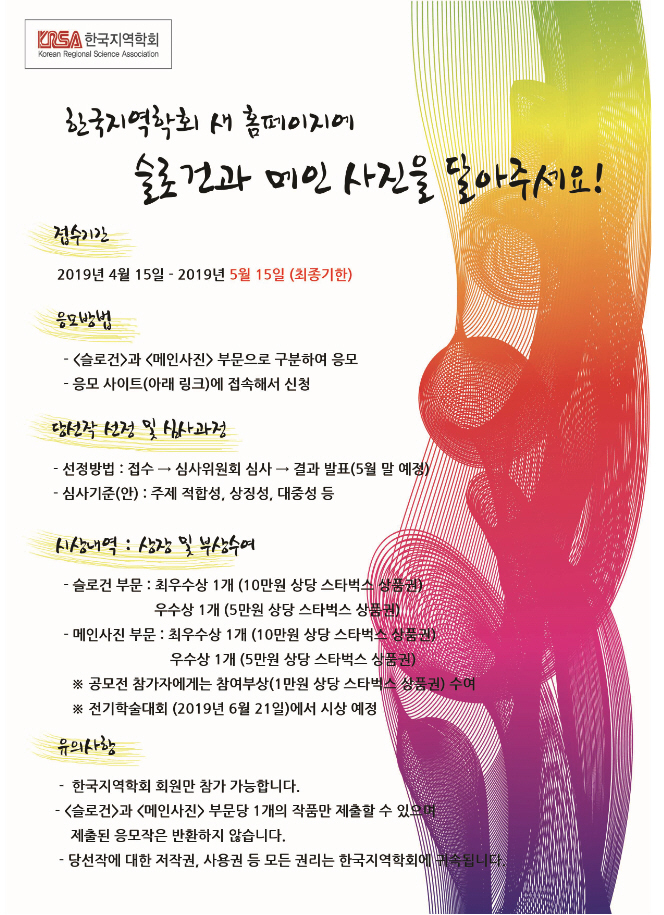 한국지역학회에서는 신규 홈페이지 오픈(5월 말)을 앞두고 새 홈페이지 메인화면에 들어갈 <슬로건>과 <메인사진>을 공모하고 있습니다.