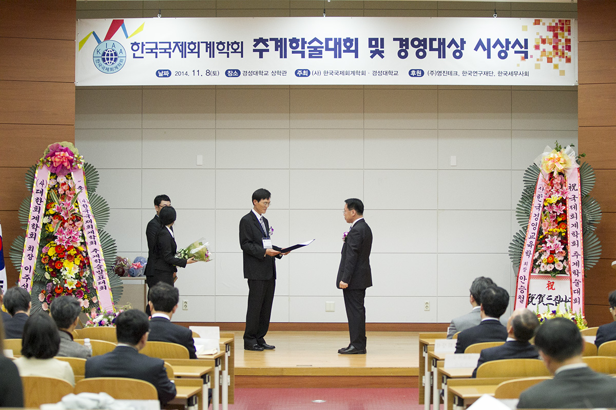 안녕하십니까? 지난 11월 8일(토) 경성대학교에서 열린 2014년 한국국제회계학회 추계학술대회 및 경영대상 시상식이 성황리에 개최되었습니다. 이번 학회는 170명이 넘는 회원님들이 참석하셔서 45의 논문을 발표해 주셨습니다. 바쁘신 와중에도 먼 길을 마다하지 않으시고 참석해 주신 회원분들과 멀리서 관심 가져주신 모든 분들께 감사드립니다. 앞으로도 학회발전을 위해 많은 관심 부탁드립니다.