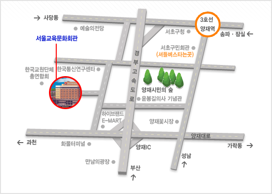 4월23일 개최될 한약개발 심포지움 장소안내입니다. 장소 : 서울교육문화회관 가야금B홀 교통편은 아래와 같습니다. >지하철 3호선 양재역7번출구→서초구민회관 앞→무료 셔틀버스 이용 3호선 양재역7번출구→마을버스 승차장→서초08번 이용 >시내버스 분당,성남방면 - 4421, 4423, 66-1, 4422 (양재2동사무소,양재 꽃시장 하차→횡단보도 건너 도보5분 소요) 강남방면 - 4421, 4423, 66-1, 4422, 4312, 4424 ,9202 (AT센터,양재 꽃시장 하차→도보5분 소요) 과천,안양방면 - 4424, 11-6, 11-3, 4312, 4424, 9202 (화물터미널 또는 양재 꽃시장 하차→횡단보도 건너도보5분 소요) 잠실방면 - 11-3,11-6 (AT센터,양재 꽃시장 하차→도보5분 소요) >좌석버스 분당,성남방면 - 9412, 9410, 1005, 1006, 2002-1, 9406, 3000, 3001, 5000, 5001, 5100, 5200 (시민의 숲,양재 꽃시장 하차→횡단보도 건너 도보5분 소요) 강남방면 - 9412, 9410, 1005, 1006, 2002-1, 9406, 3000, 3001, 5000, 5001, 5100, 5200 (양재 꽃시장 하차→도보5분 소요) 과천,안양방면 - 3030 (시민의 숲,양재 꽃시장 하차→횡단보도 건너 도보5분 소요) 약도는 첨부파일을 참고하시기 바랍니다.