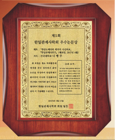 2018년 4월에 시행된 한일관계사학회 제5회 학술상 논문은 건국대학교 나행주 선생님에게 수여되었습니다.