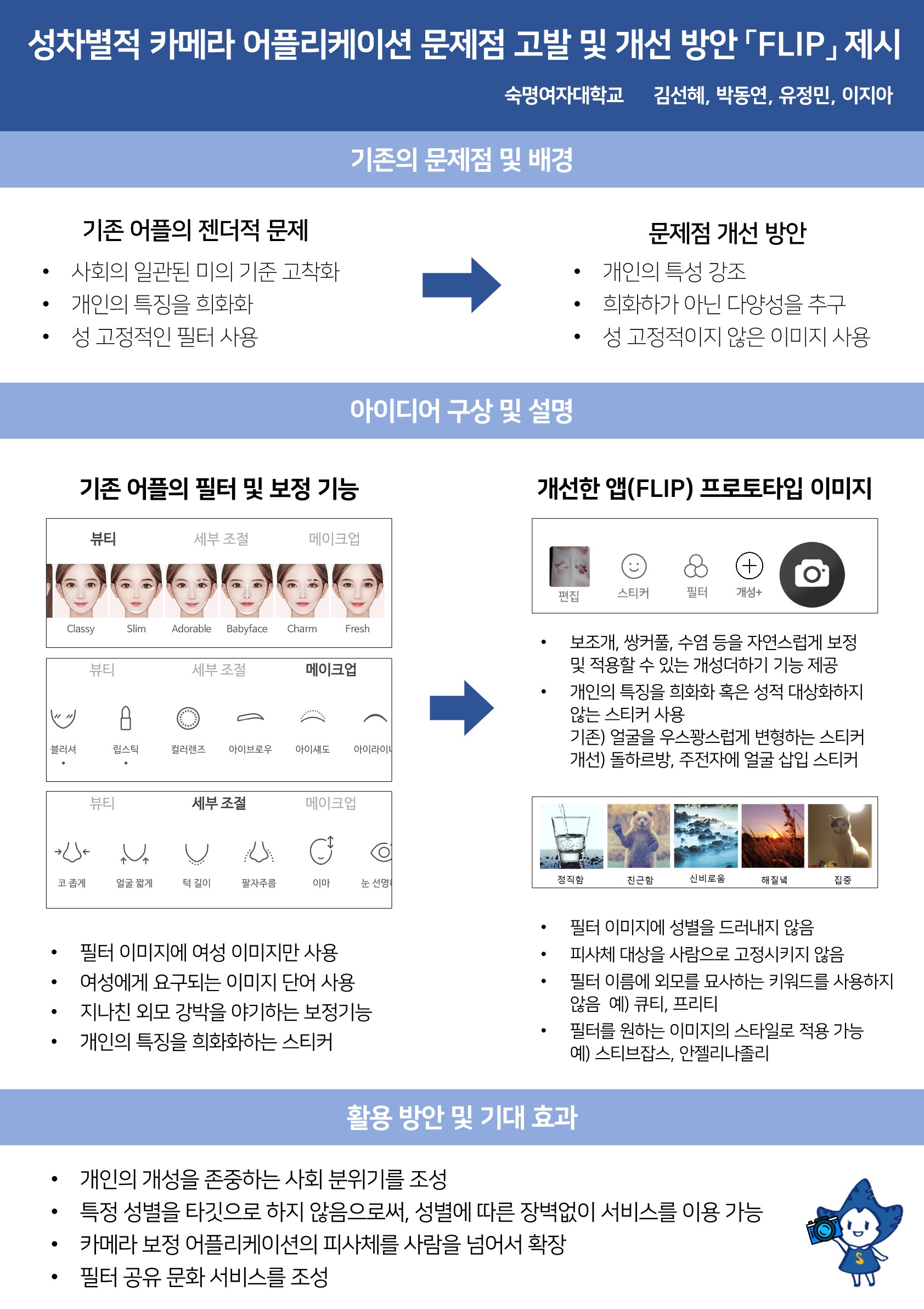 현재 우리 사회 구성원들이 사용하고 있는 어플의 필터 및 보정기능을 분석하고, 개선한 앱의 프로토타입 이미지를 제안한다.