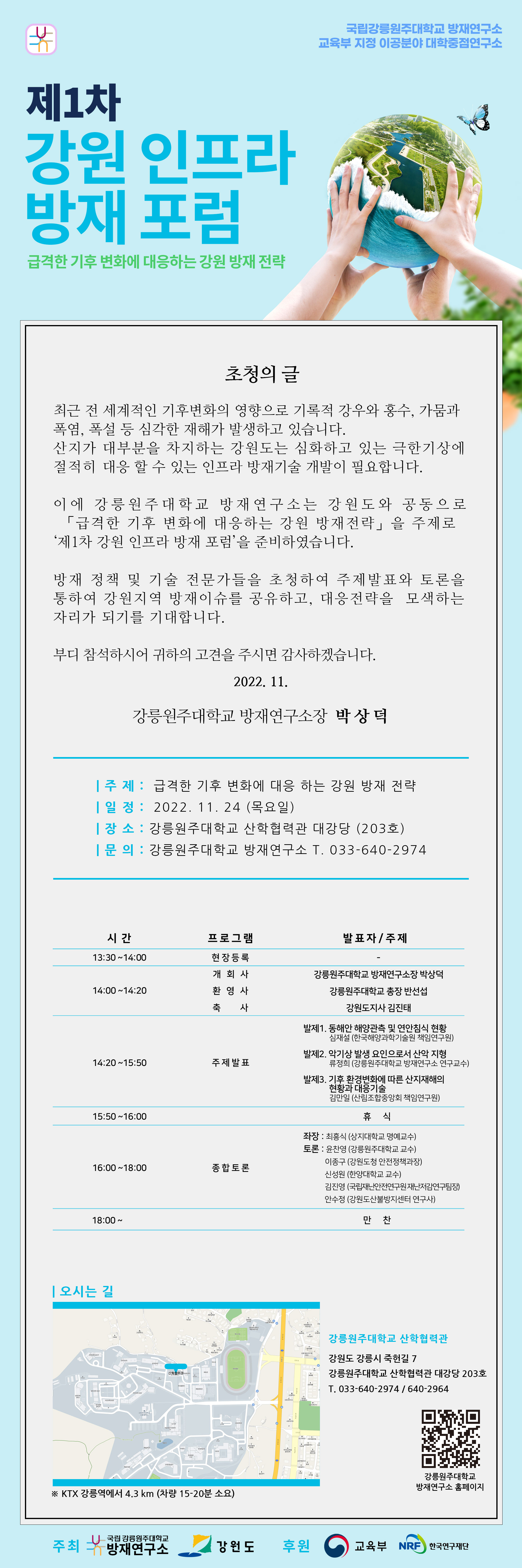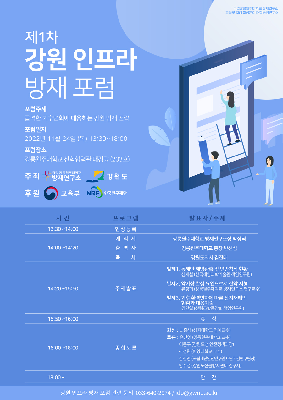 강릉원주대학교 방재연구소에서「급격한 기후 변화에 대응하는 강원 방재전략을 주제로 ‘제1차 강원 인프라 방재 포럼’ 을 아래와 같이 개최하고자 합니다.