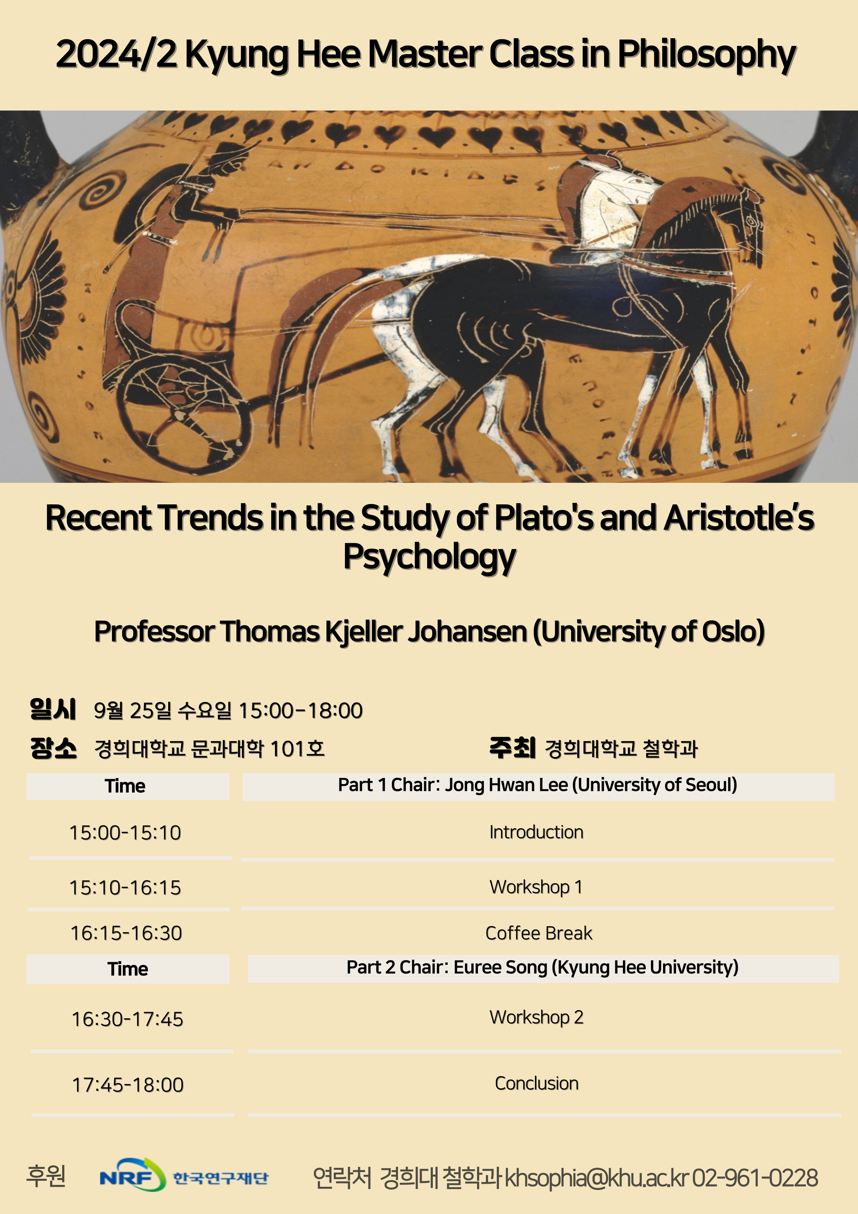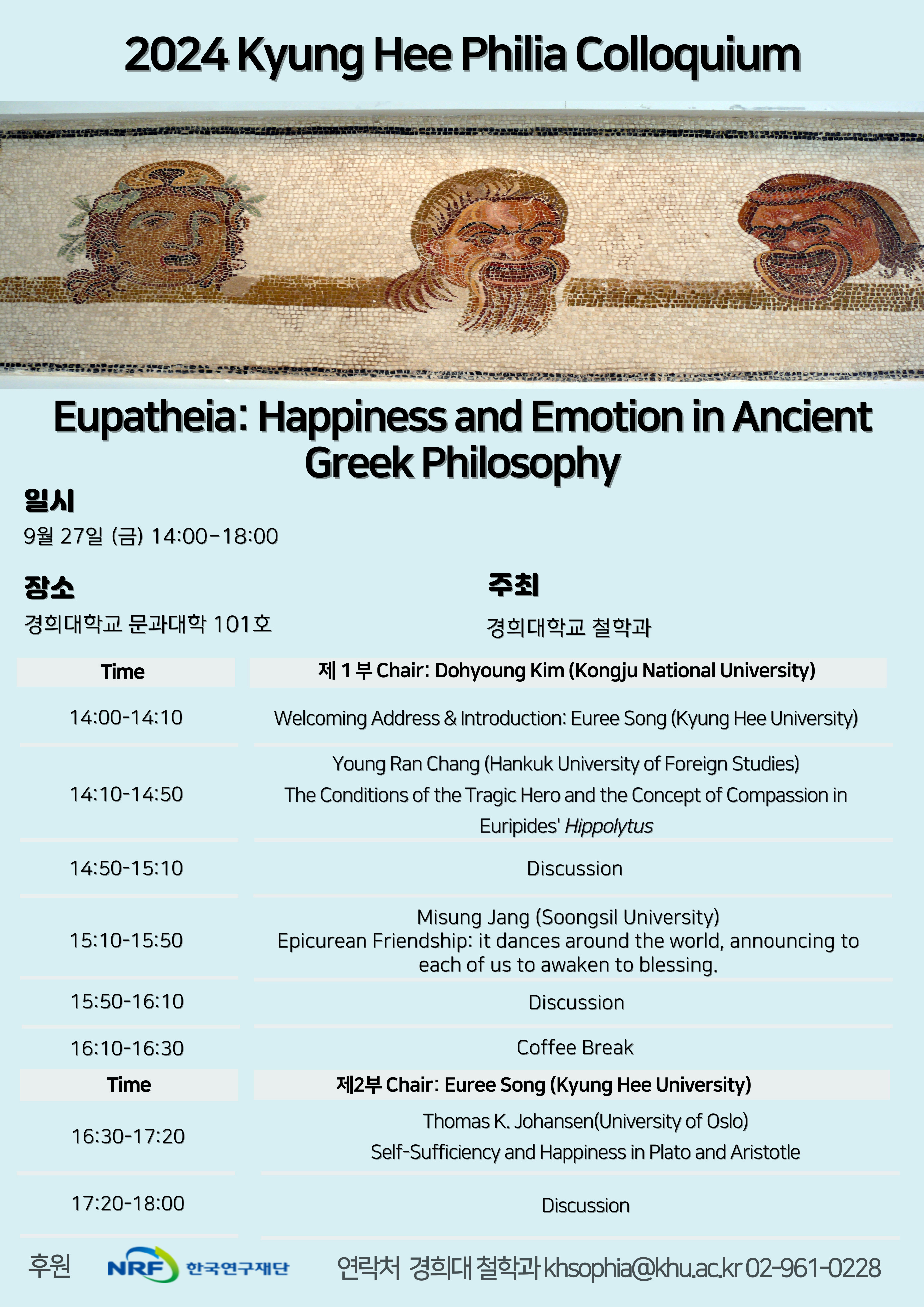 9월 25일 (수) 오후 3시부터 6시까지 플라톤과 아리스토텔레스의 영혼론에 대한 최신 연구 동향에 대한 강연 및 워크샵이 열리고, 27일 (금) 오후 2시부터 6시까지 Eupatheia: Happiness and Emotion in Ancient Philosophy라는 주제하에 한국외대 장영란 교수와 숭실대 장미성 교수, 그리고 Johansen 교수의 강연을 청해 듣는 자리를 마련했습니다. 장소는 경희대학교 문과대학 101호입니다. 자세한 사항은 포스터를 참고해 주시기 바랍니다. 이 두 행사는 한국연구재단의 국제협력프로젝트 "Eupatheia: 고대철학에서 행복과 감정의 관계" 의 지원을 받았습니다.