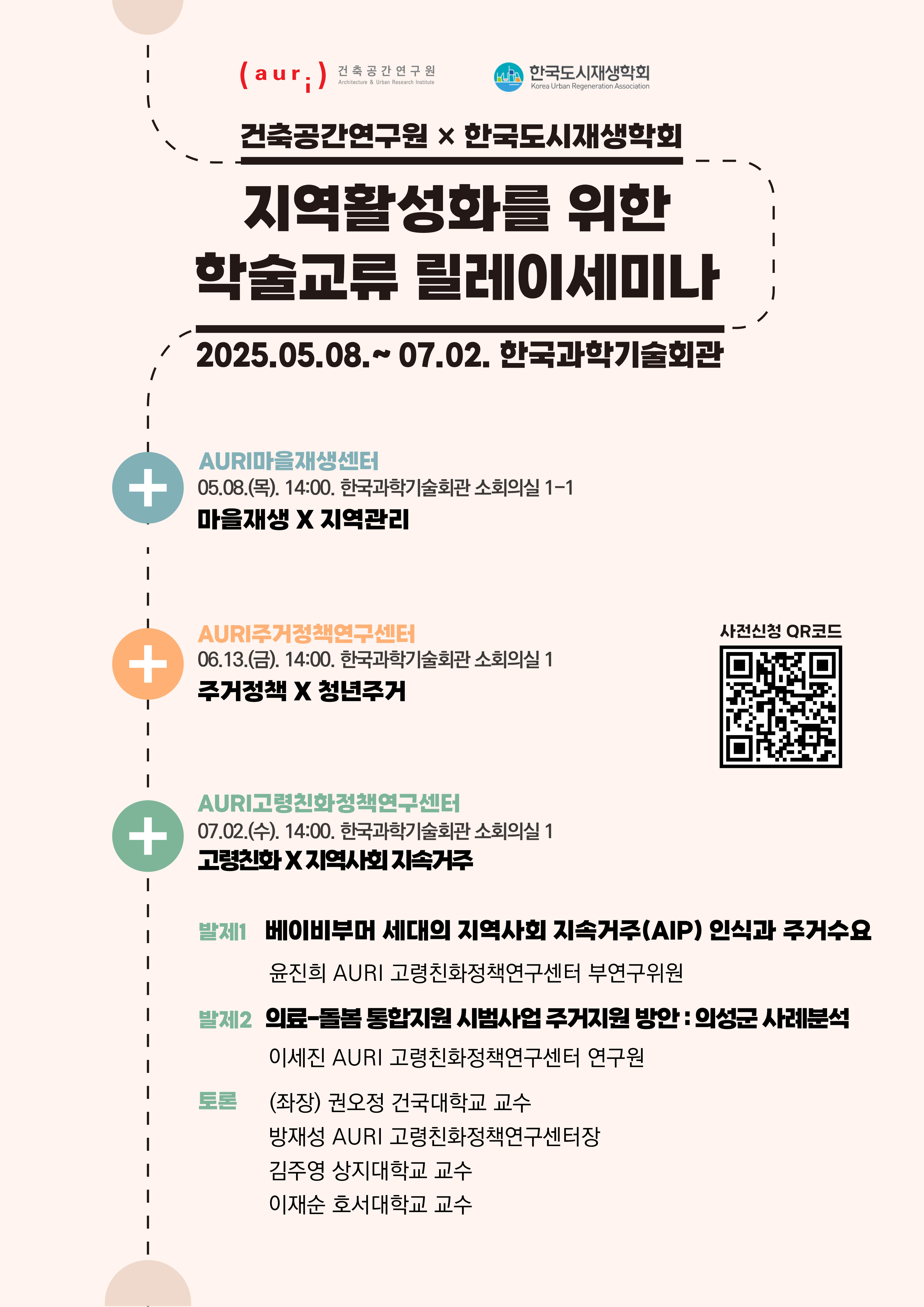 건축공간연구원과 한국도시재생학회는 고령친화 사회로의 전환에 대응하여, 고령자의 지역사회 내 지속거주(AIP)를 위한 주거환경 및 정책적 과제를 모색하고자 '건축공간연구원-한국도시재생학회 릴레이세미나 '고령친화 × 지역사회 지속거주'를 아래와 같이 개최하고자 합니다.